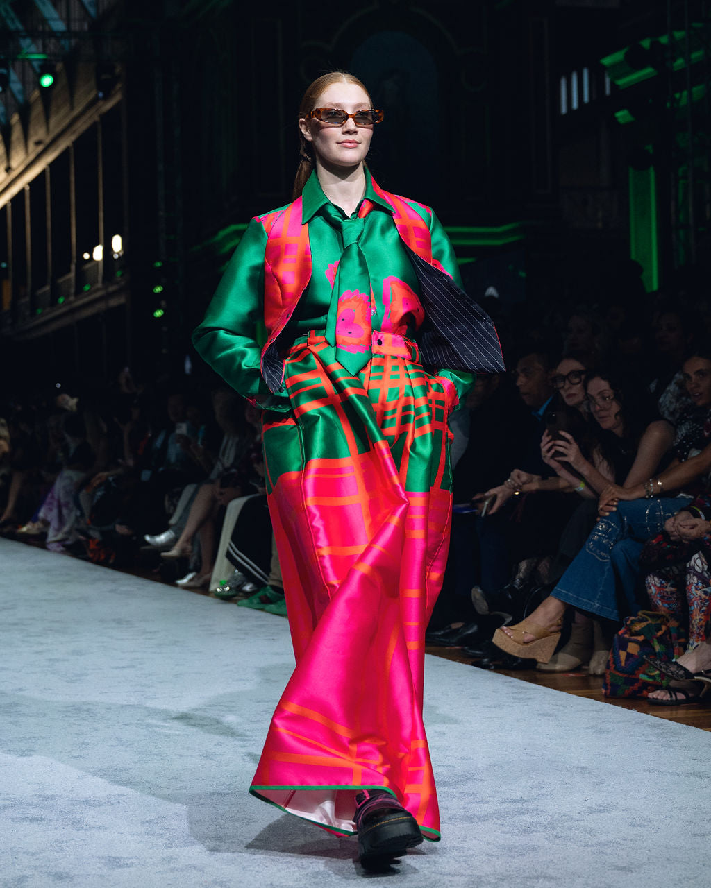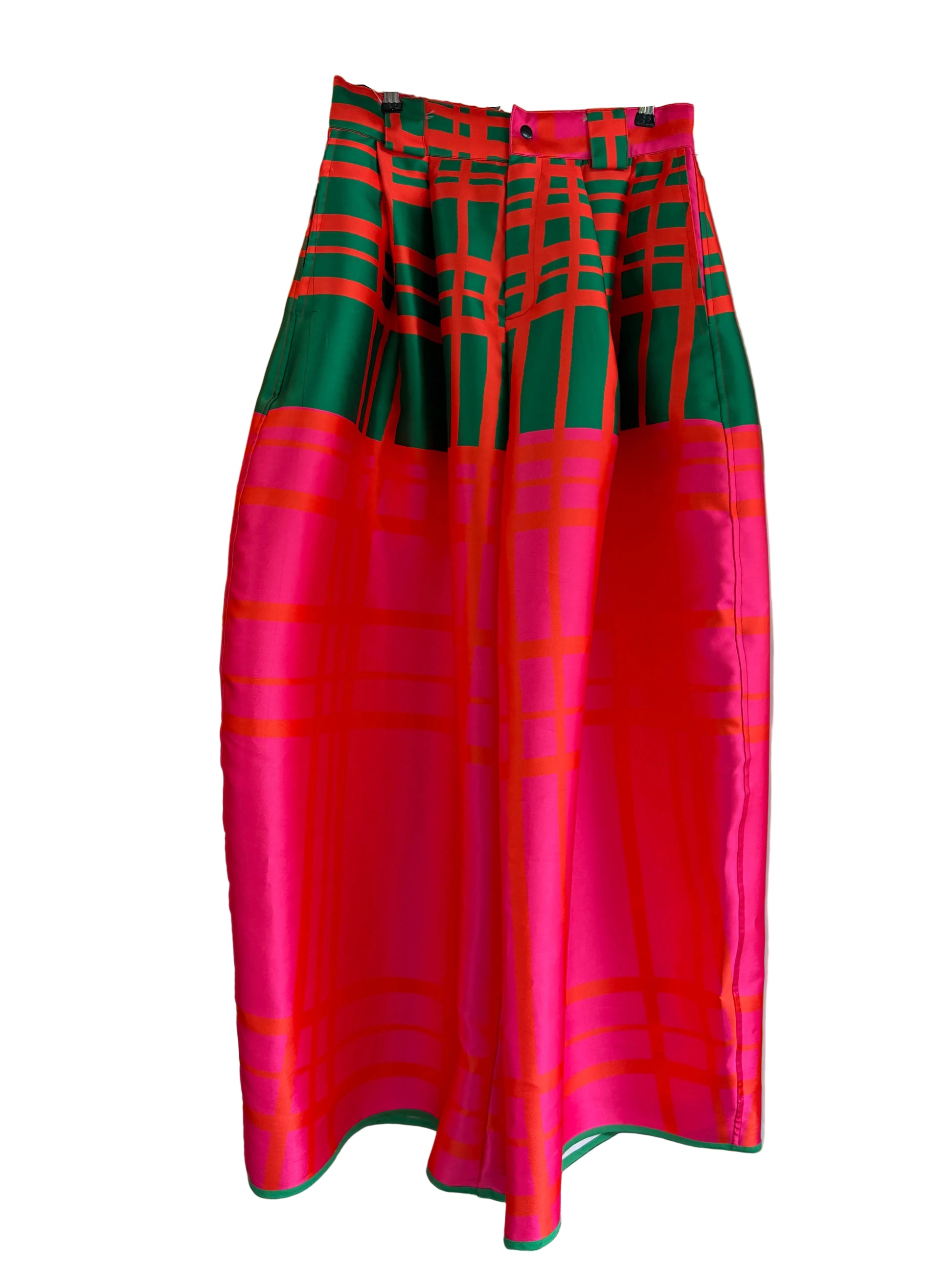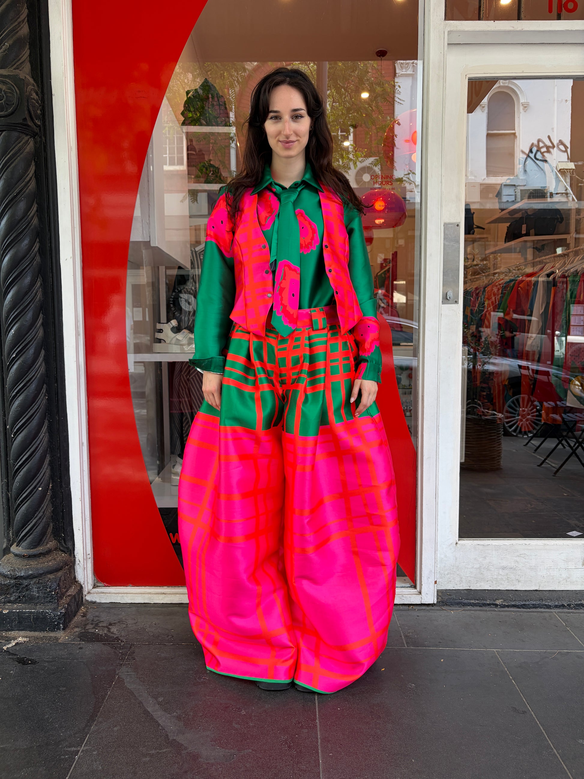 One off wide Ladd pant with FOOL green top and pink lower fence print.